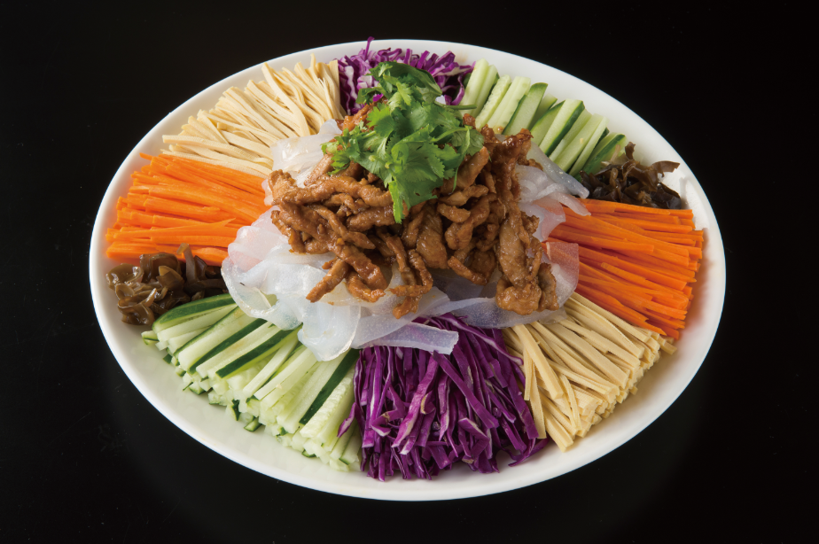 上海亭特製ダレをかけ豪快に混ぜてから頂く。野菜本来の味を楽しめ、色鮮やかなので目でも愉しめる一品。